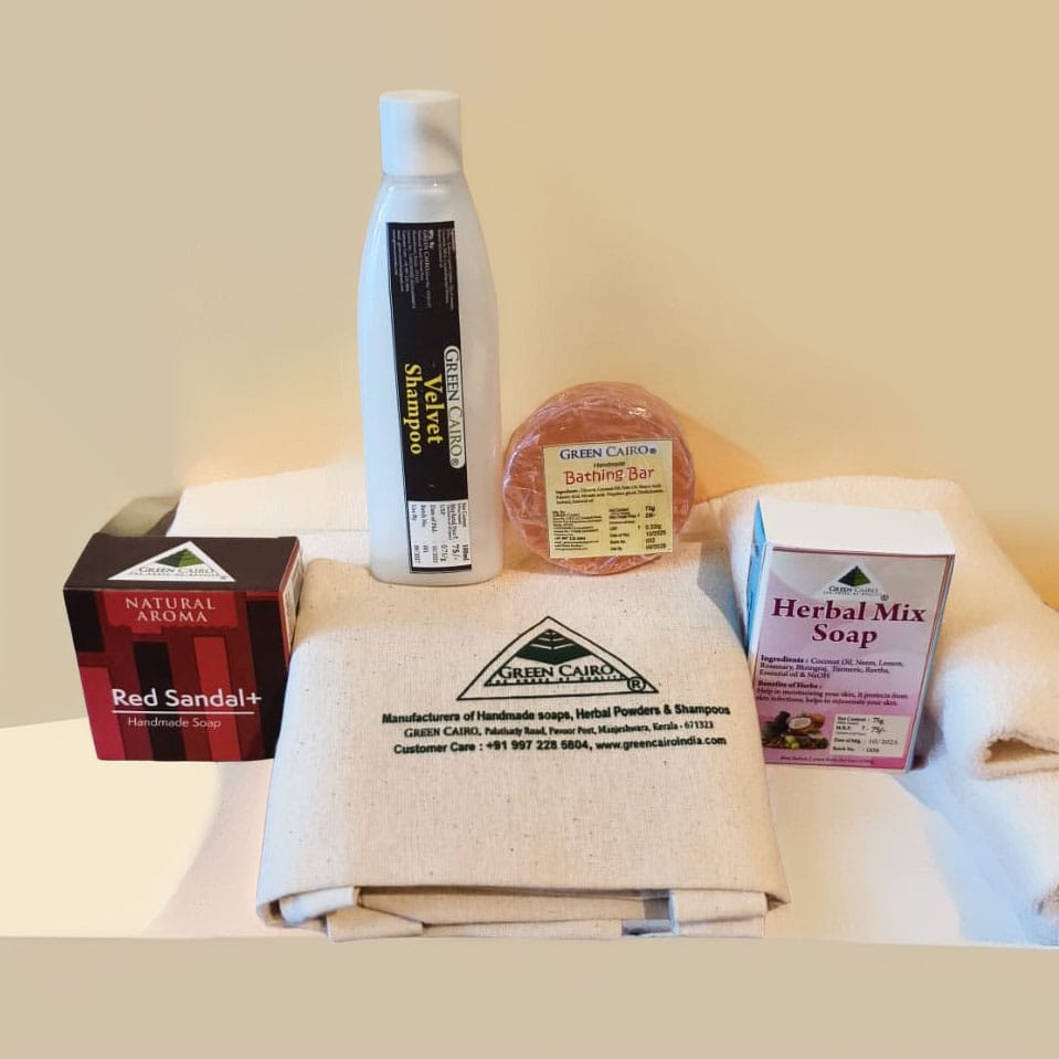 Includes Velvet Shampoo, Herbal Mix Soap, Red Sandal Soap, Bathing Bar, and a reusable eco cotton pouch.
